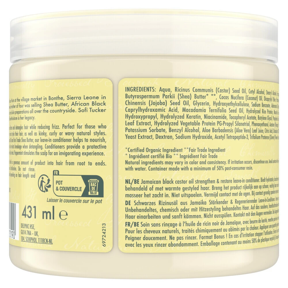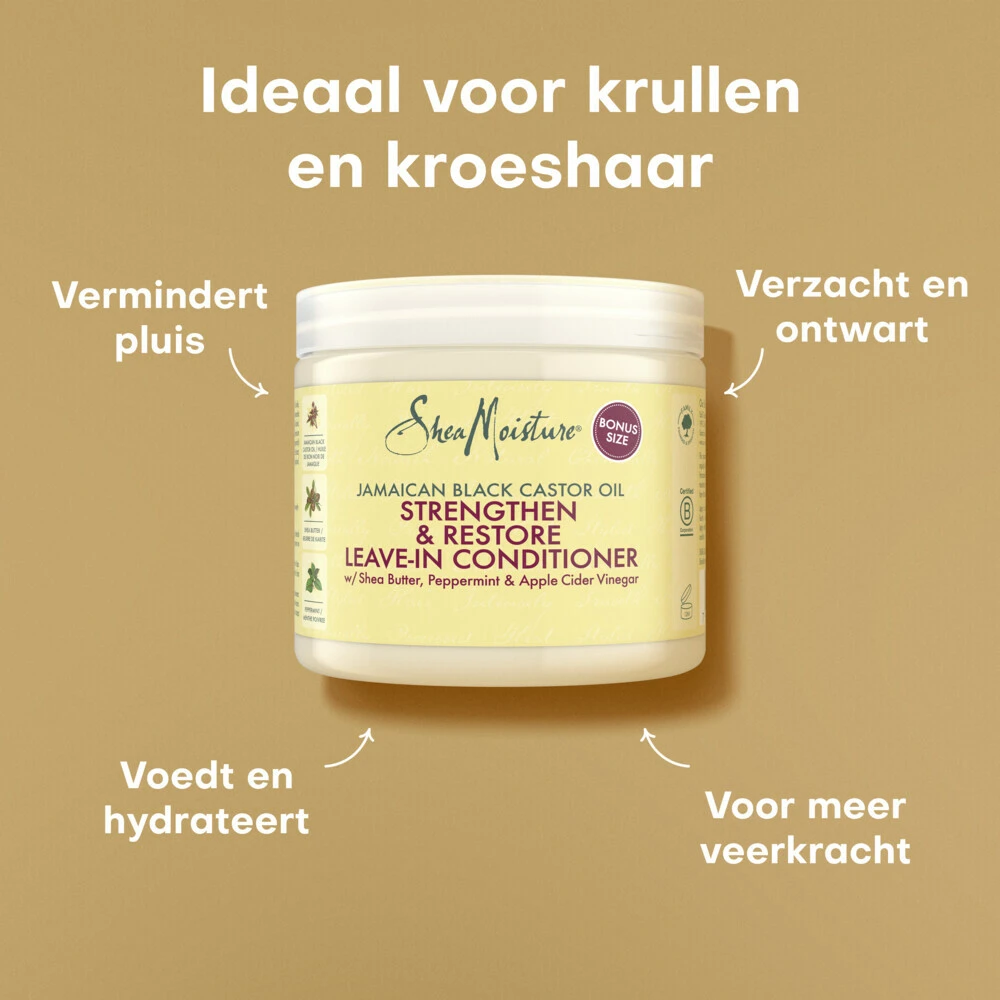 SheaMoisture Jamaican Black Castor Oil Strenghten & Restore Leave-In ConditionerSheaMoisture Jamaican Black Castor Oil Strenghten & Restore Leave-In Conditioner voor krullend haar biedt hydratatie, glans en bescherming tegen haarbreuk.De conditioner is verrijkt met sheaboter en Jamaicaanse zwarte castorolieHydrateert je haar en ondersteunt de elasticiteit om haarbreuk te voorkomenEen beschermende laag die het uiterlijk van gespleten haarpunten verbetertDeze leave-in conditioner is silico
